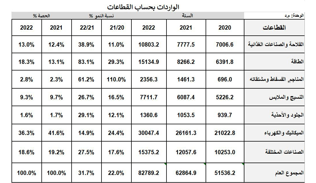 الواردات بحساب القطاعات خلال الفترة 2020-2022